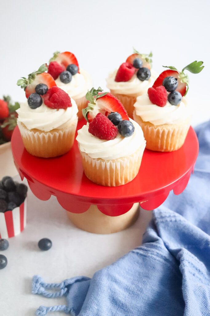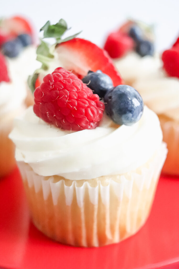 If baking isn’t your thing, then you can easily dress up box cake mix cupcakes with berries and/or a flag pick. If you want my fluffy vanilla cupcake recipe, then scroll to the bottom for the full recipe. I completey blanked on getting cream cheese at the store, so here I used a store-bought cream cheese frosting that works just as well!